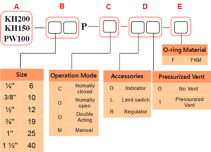 ● D: 공압 타입에만 사용 가능(수동 불가). O는 가압 공기 구멍이 있는 표시등(일반적으로 KH150 및 KH200에 사용되지만 PW100은 모두 가압 공기 구멍 없음)에 대한 옵션이며, L은 신호 장치, R은 가압 공기 구멍이 없는 레귤레이터입니다. 또한 일반적으로 기본 타입에는 가압 공기 구멍이 없으며 옵션 액세서리가 없다는 점에 유의하십시오(아래 차트 참조)