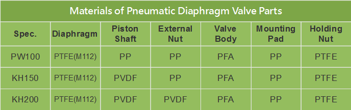 ● E: 필수소재, 현재 O-링(공압 다이어프램 밸브 내부의 링)에는 FKM만 사용 가능
